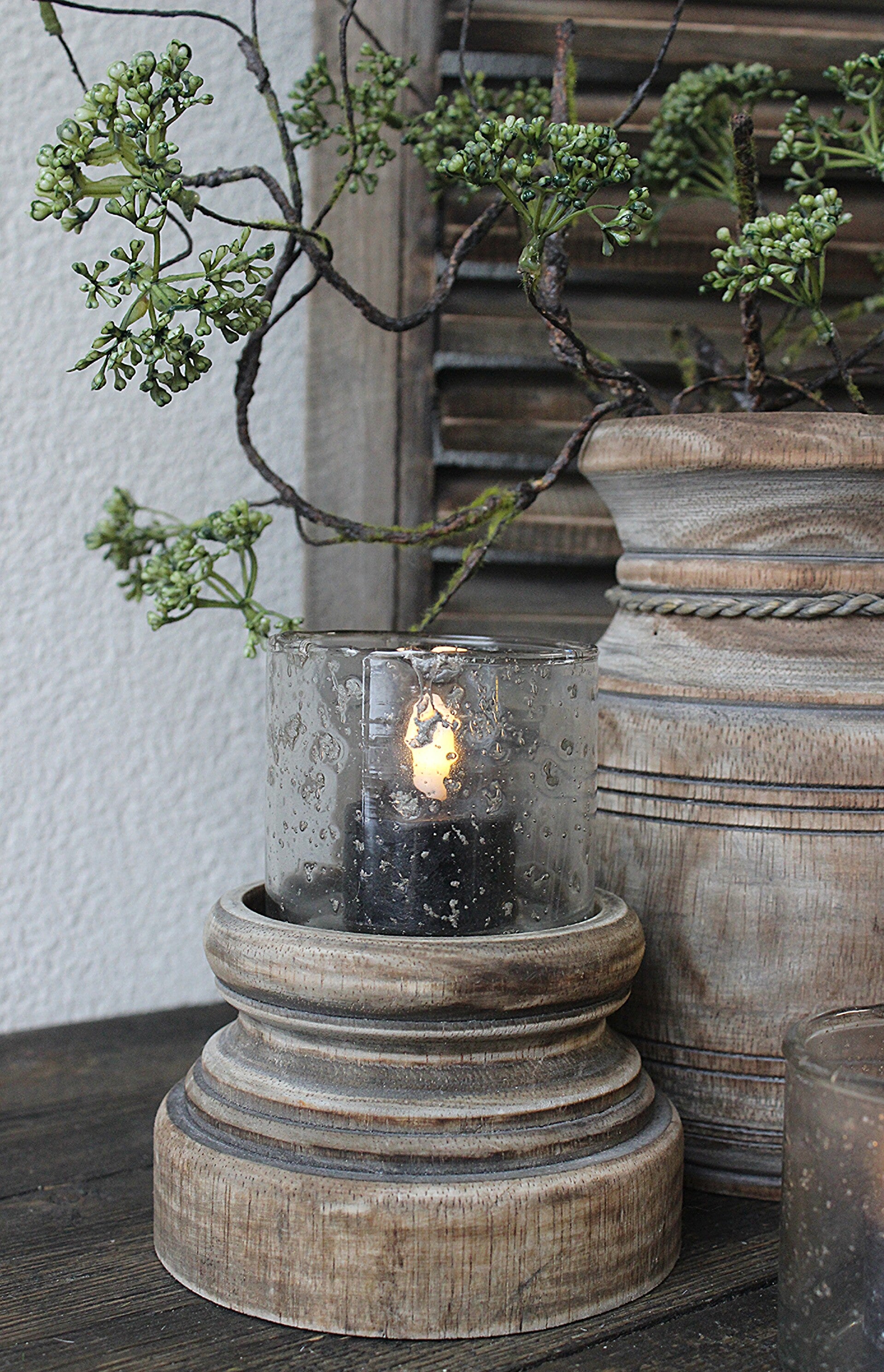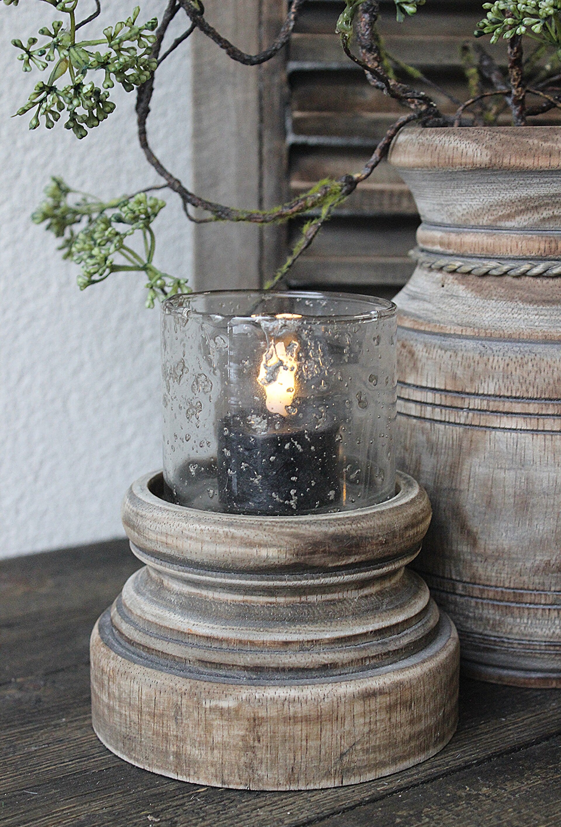 Houten stompkandelaar, inclusief bubbelglaasje. Het bubbelglas wordt los meegeleverd en kan eenvoudig worden vervangen door een stompkaars. Licht verweerd hout.