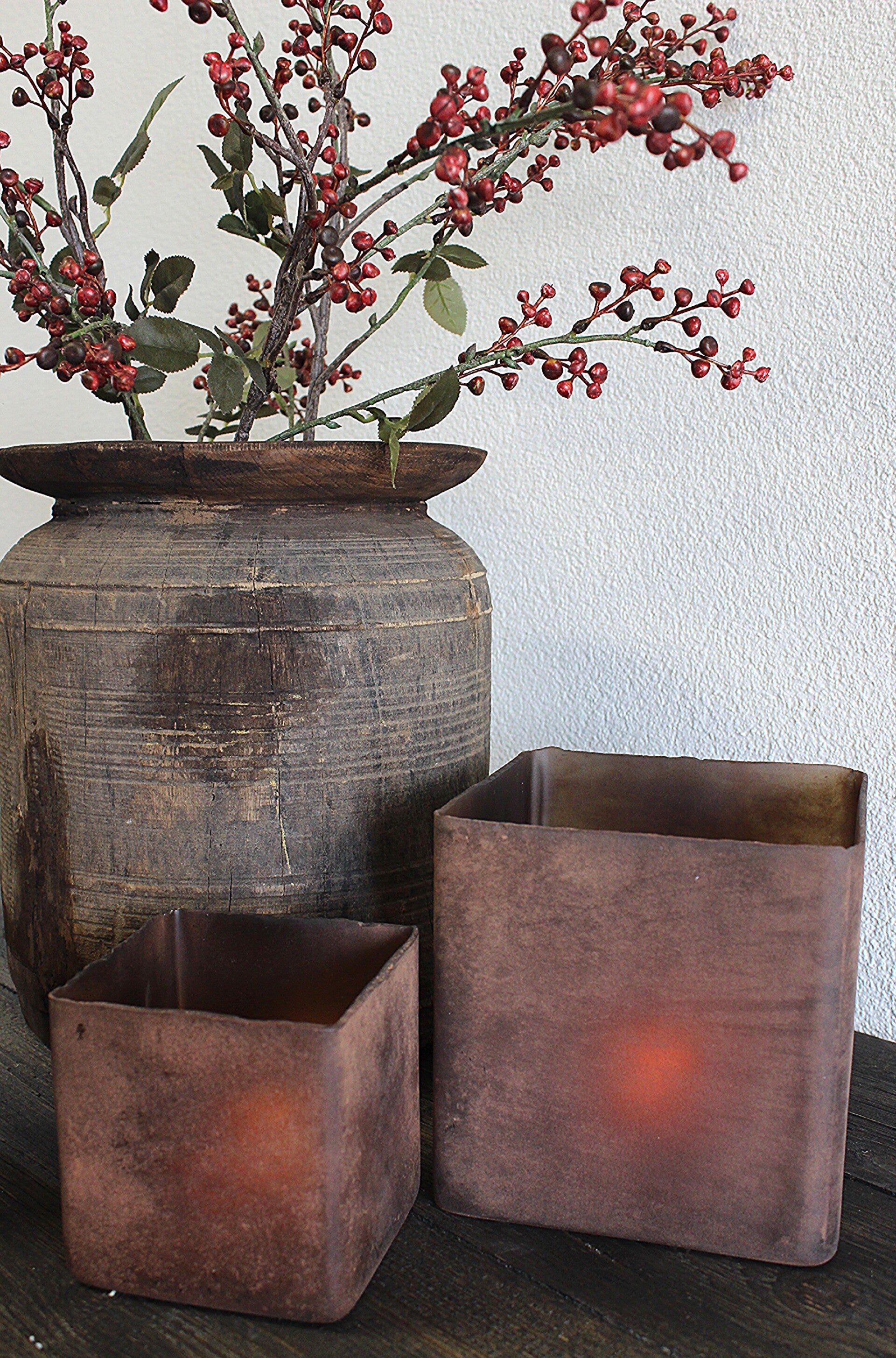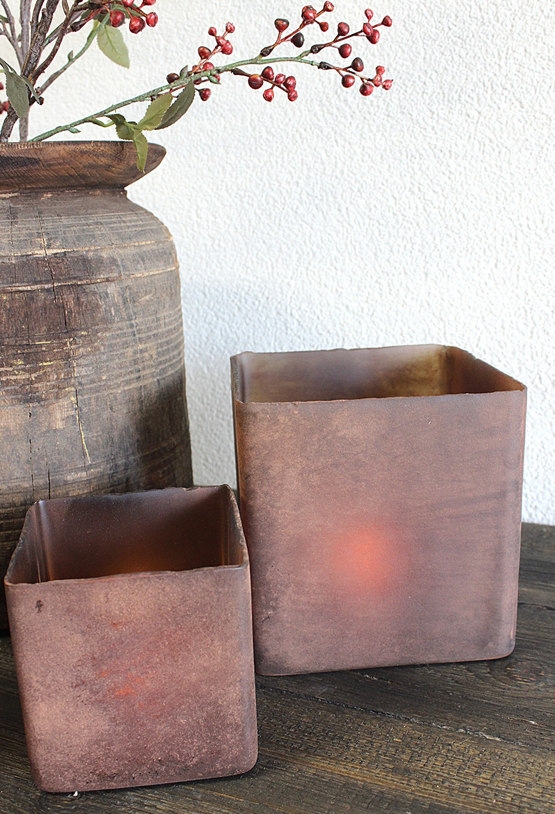 Stijlvolle vierkante windlichten in roestkleur, leverbaar in drie maten.