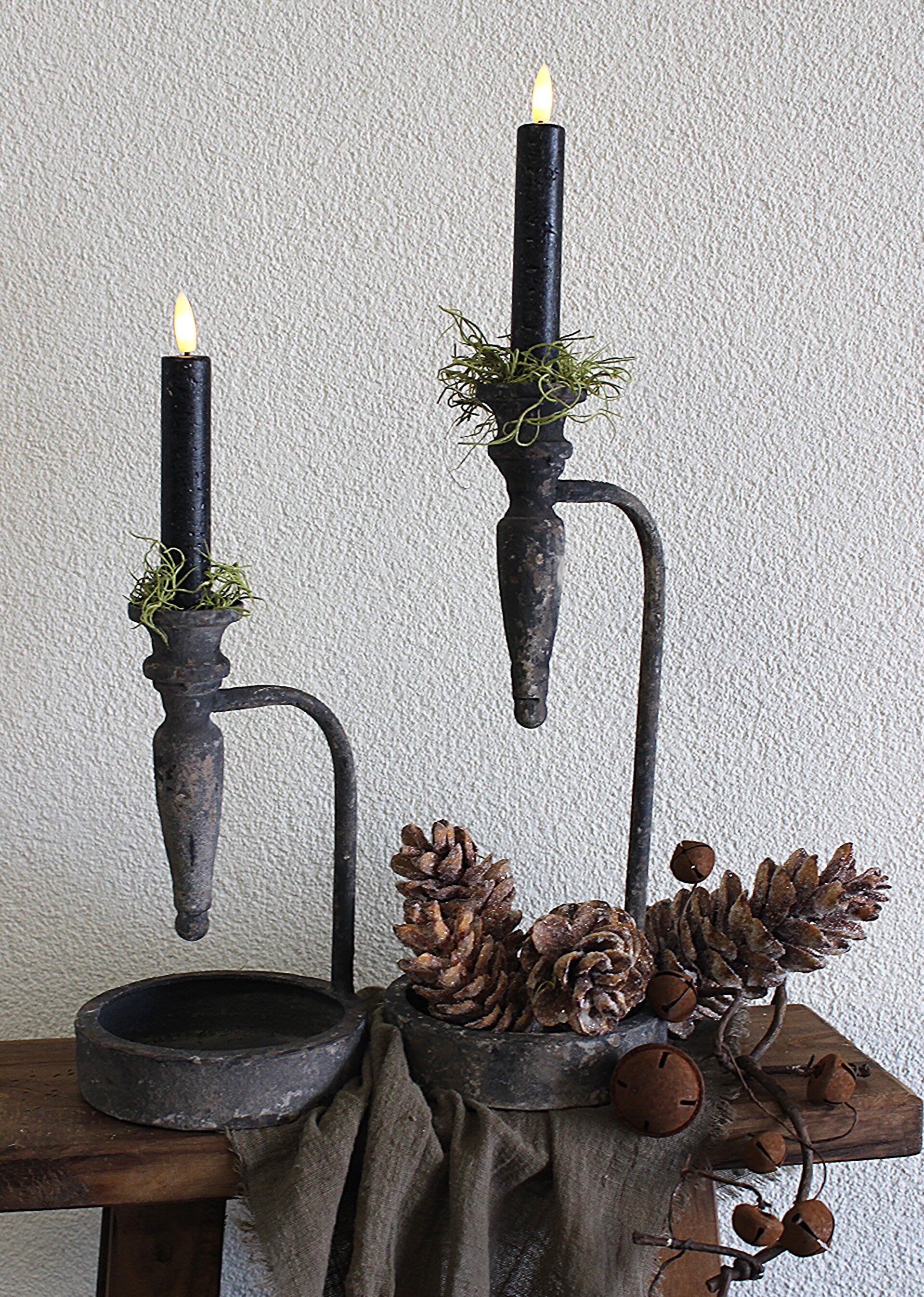 Elegante ijzeren kandelaars op voet, beschikbaar in twee maten. Dankzij de opengewerkte voet kun je ze prachtig stylen met decoratie, zoals dennenappels, mos of een kransje. Exclusief decoratie.