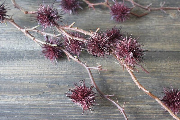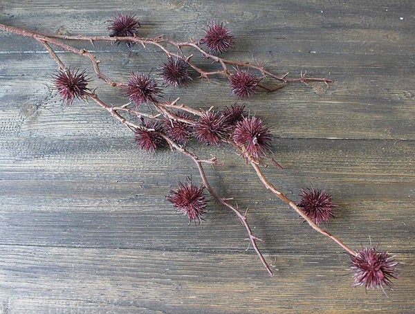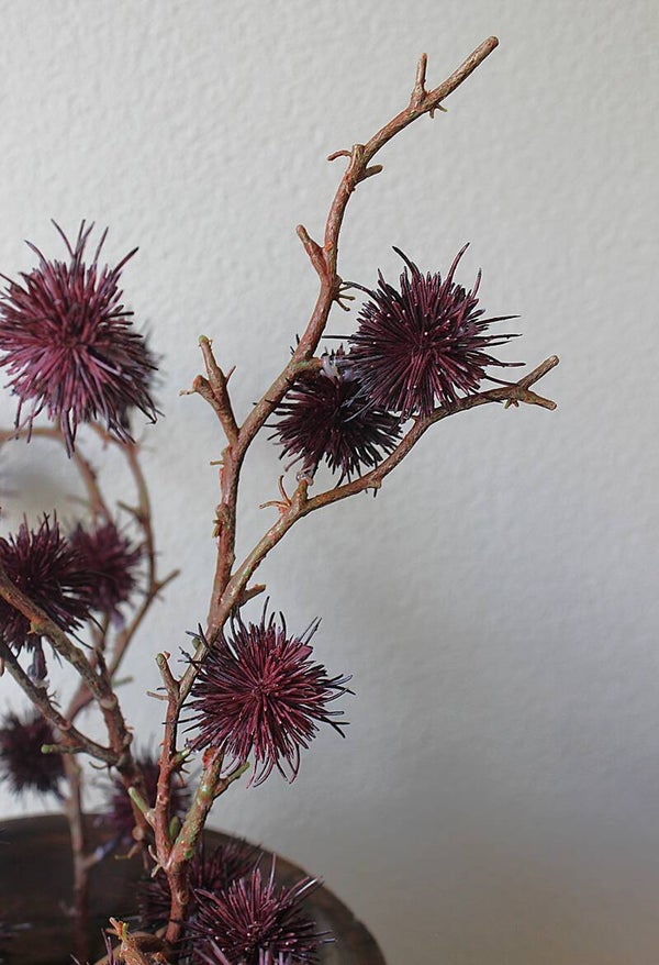 Mooi volle tak met meerdere vertakkingen, gevuld met pomponbolletjes in warme bruin-paarse herfsttinten. De tak is veelzijdig toe te passen, zowel in een vaas als in creatieve decoraties.