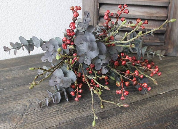 Een rijk gevuld kunstboeketje vol herfstige charme, bestaande uit een eucalyptus-toef, groen takjes en besjestakjes. Perfect om warmte en kleur in je interieur te brengen, het hele najaar door.