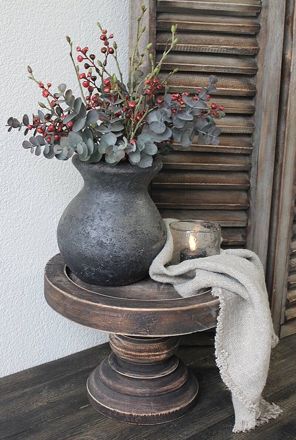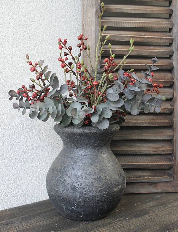 Elegant zwart stenen potje met een zachte zandfinish. Perfect voor een sobere tak of een klein boeketje.