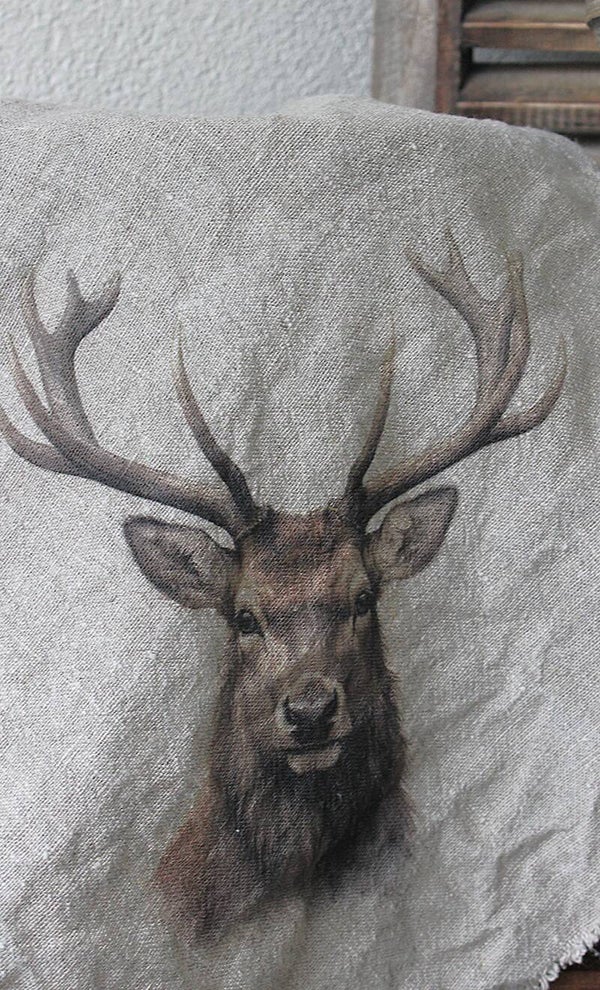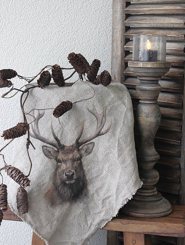 Linnen shabby-doek met een hertenkop als afdruk. De afbeelding en tekst zijn gedrukt op de punt van de doek, waardoor deze mooi gedrapeerd kan worden over een pot of in een schaal.