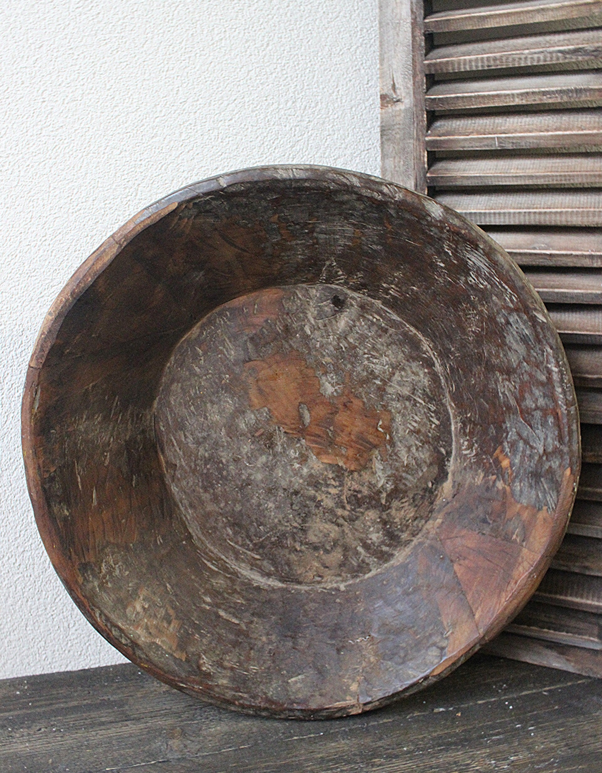 Oude, massieve houten schaal met karakter en sporen uit het verleden. Een veelzijdig decoratie-item voor in huis.