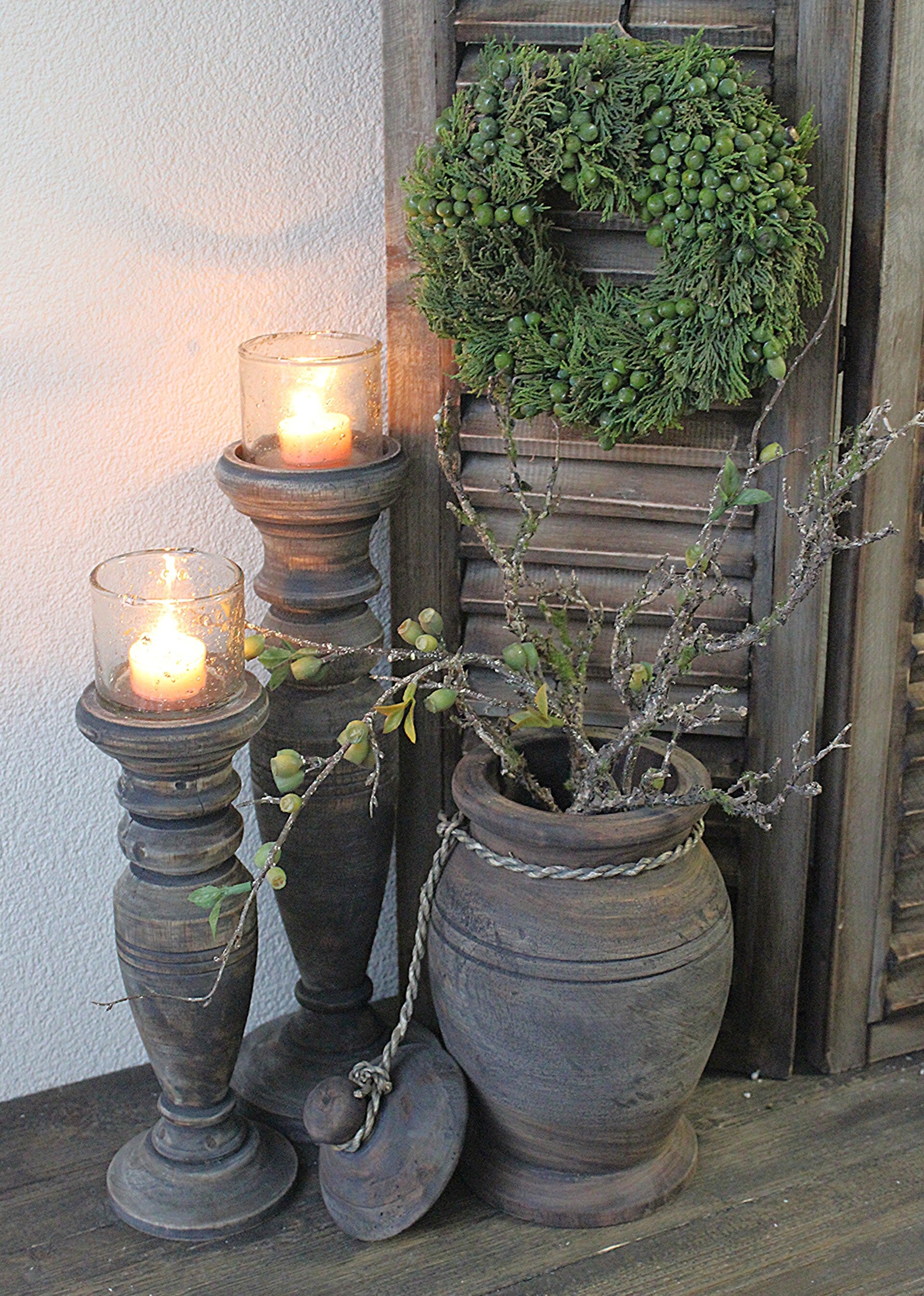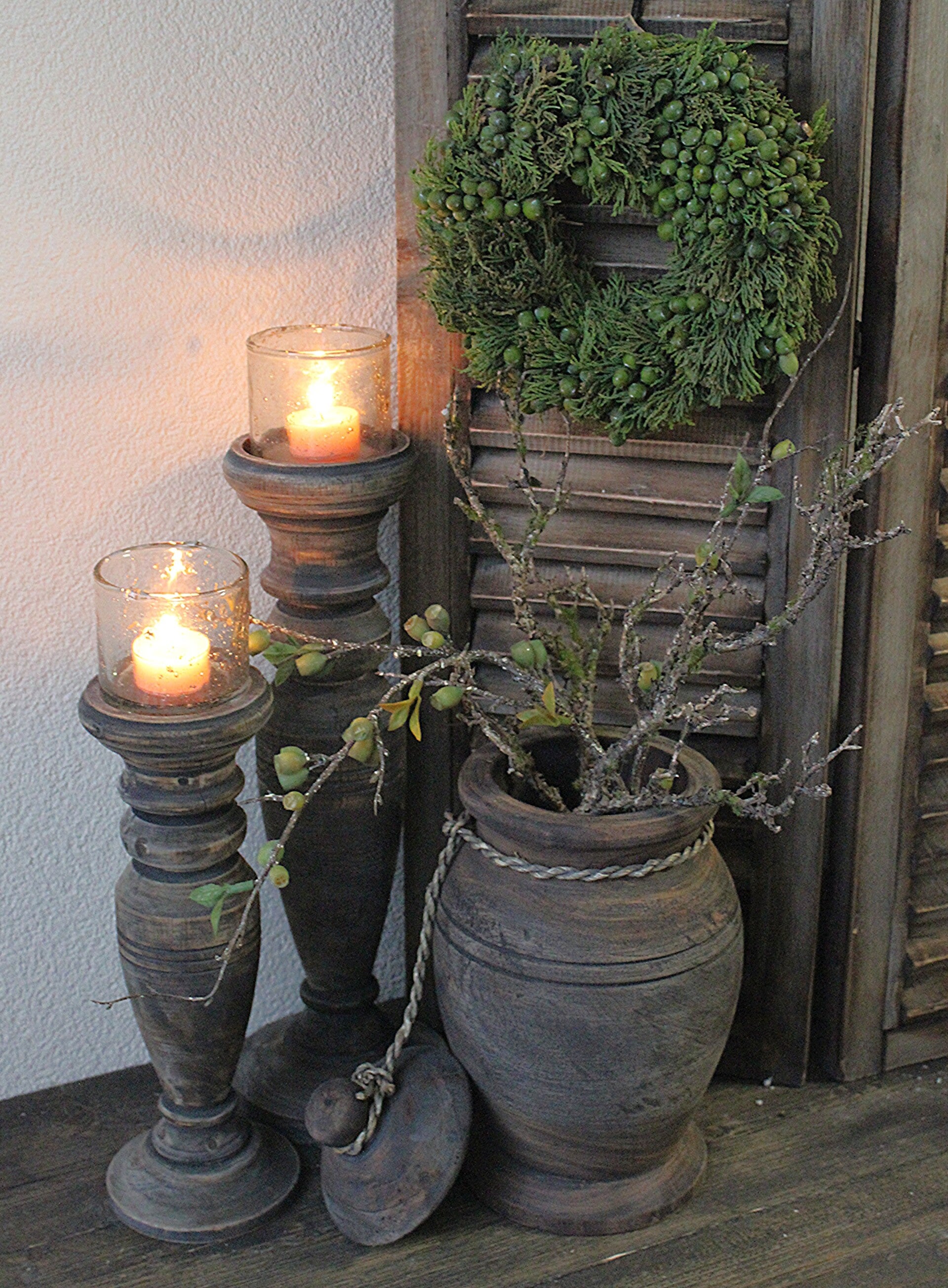 Stoere, verweerde houten pot met deksel, afgewerkt met een robuust touw.