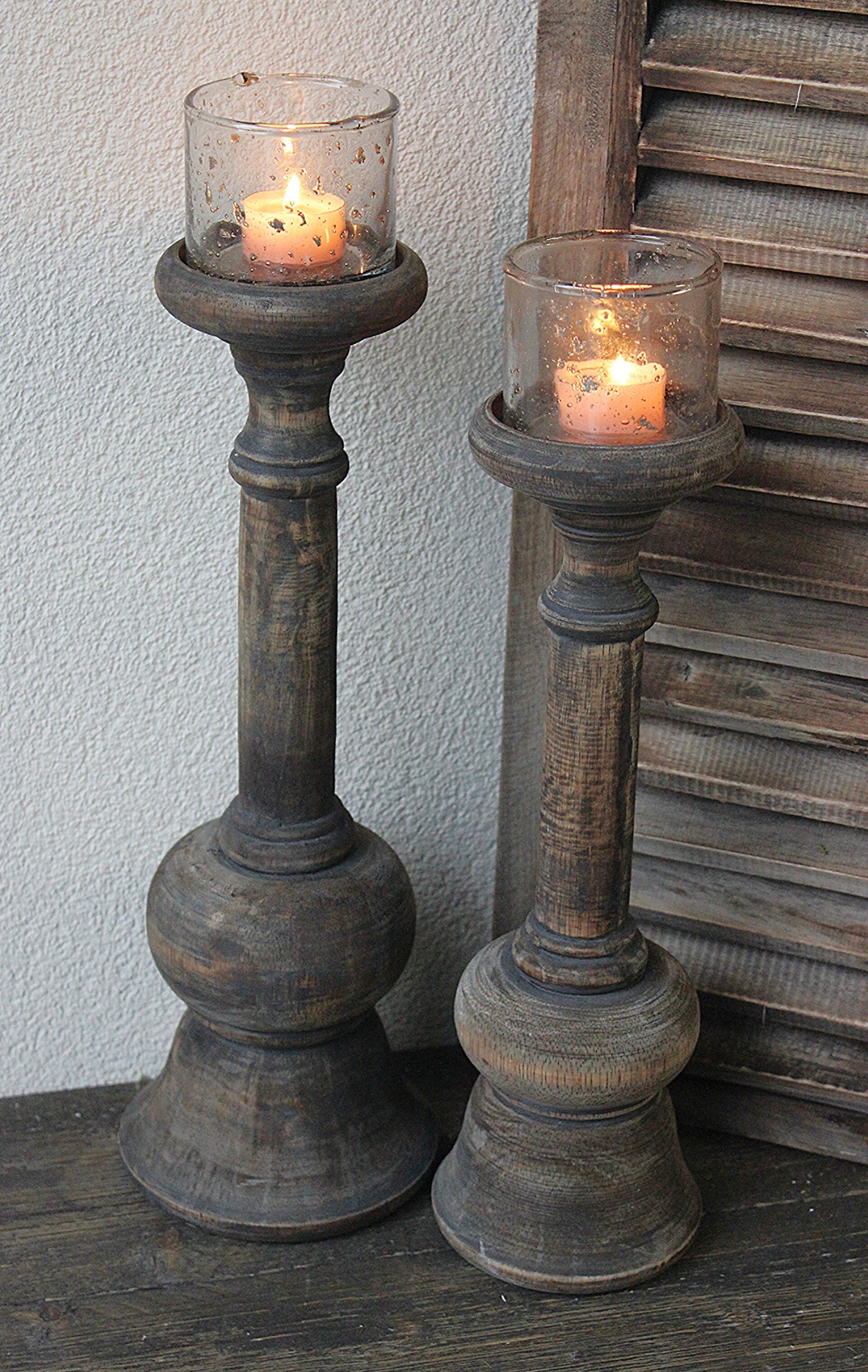 Set van twee vergrijsde, verweerde houten kandelaars met bubbelglaasjes. Perfect voor een landelijke of rustieke stijl. De Asparagus-kransjes zijn niet inbegrepen, maar kunnen apart worden besteld. Asparagus Krans - Klein