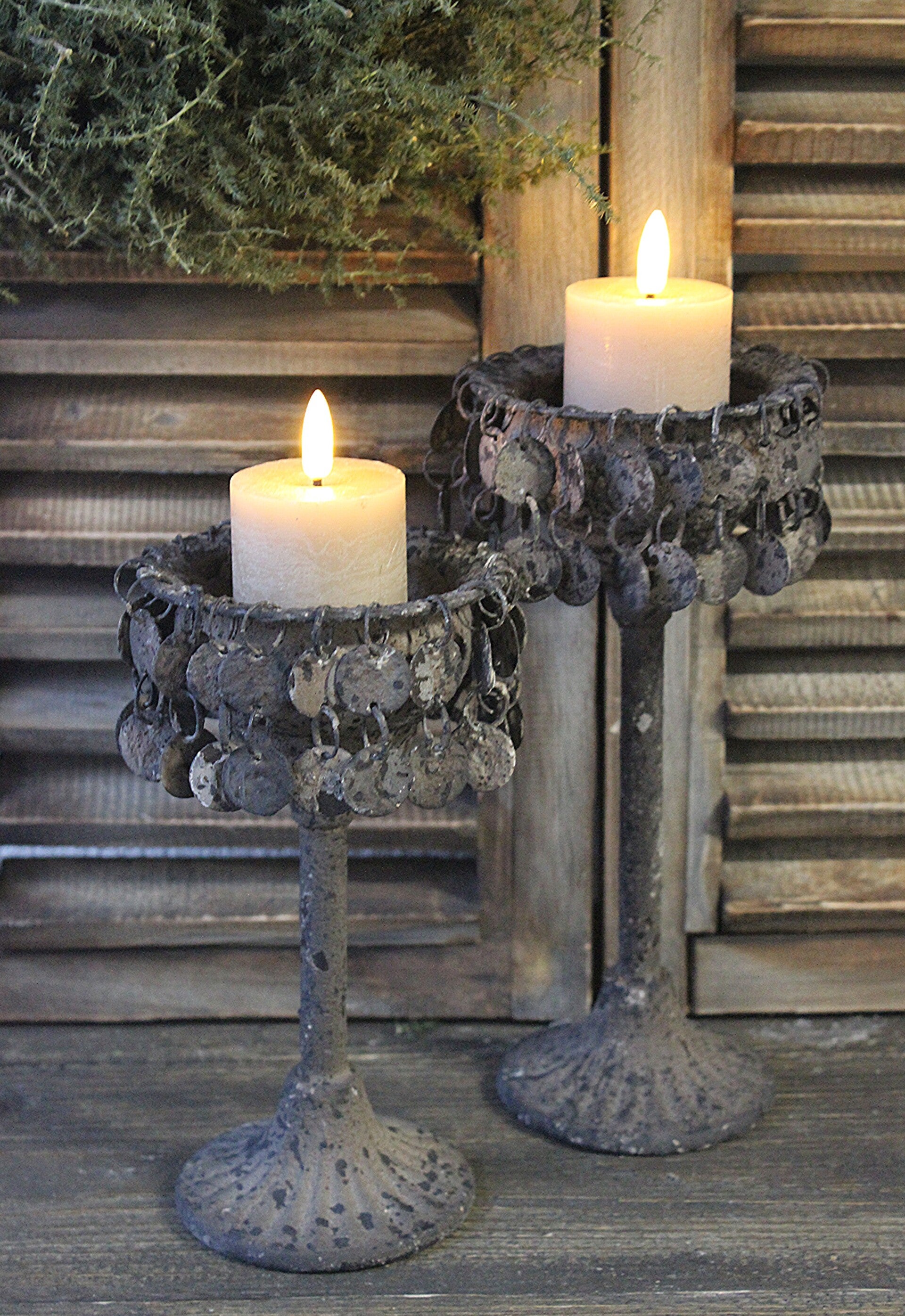 Stoere kandelaars op voet, afgewerkt met muntjes. Iedere kandelaar is uniek dankzij de speciale afwerking. Verkrijgbaar in twee formaten.