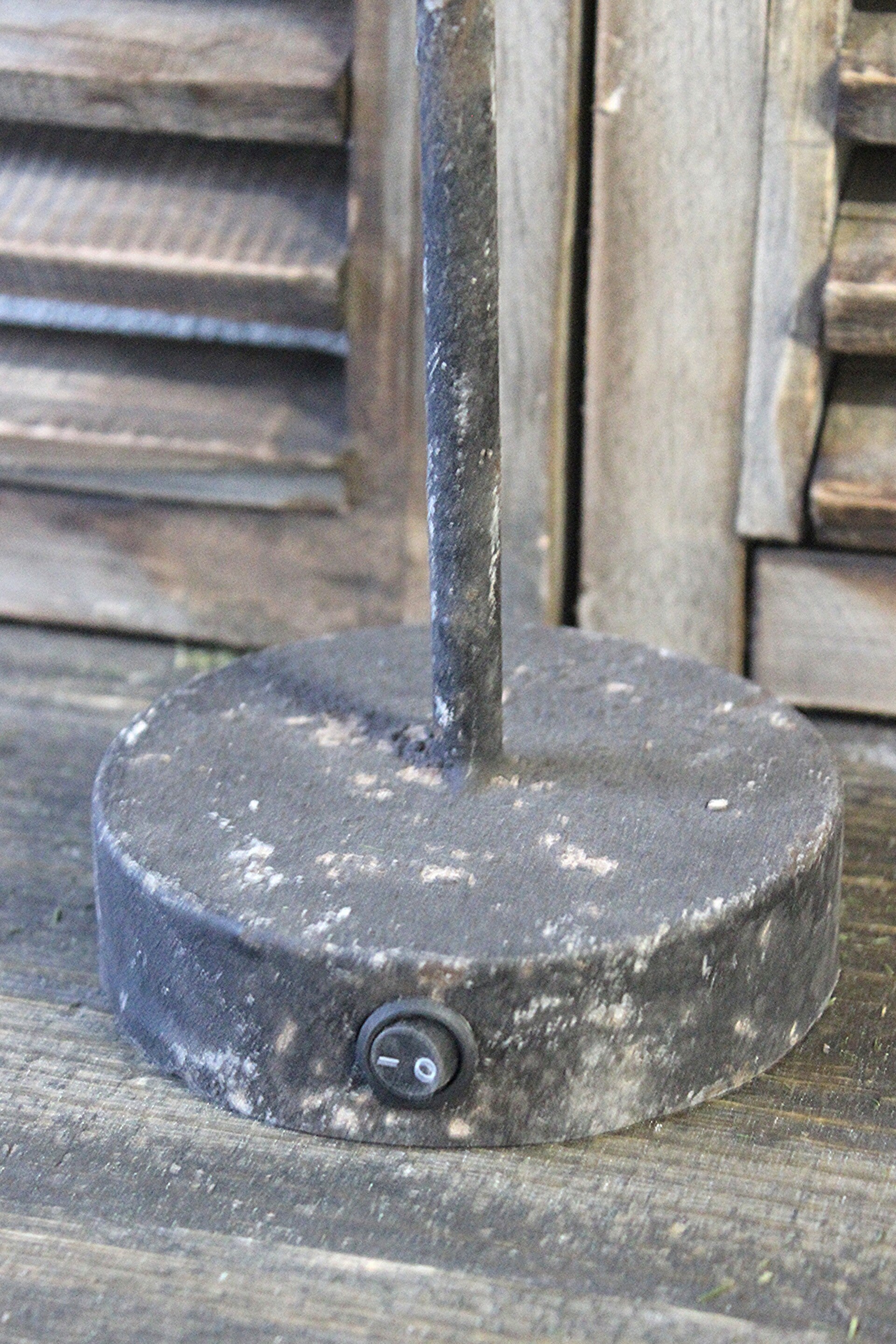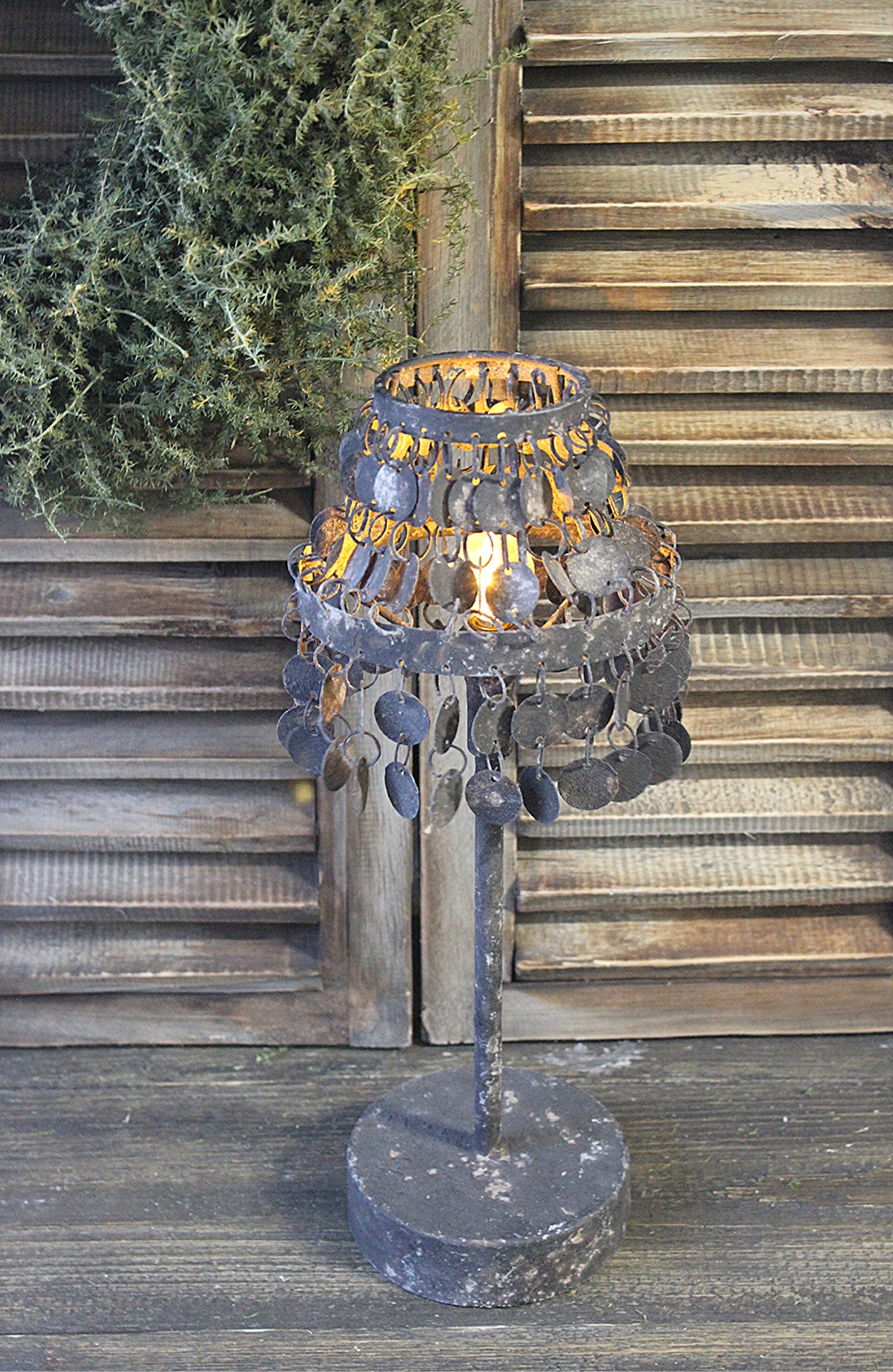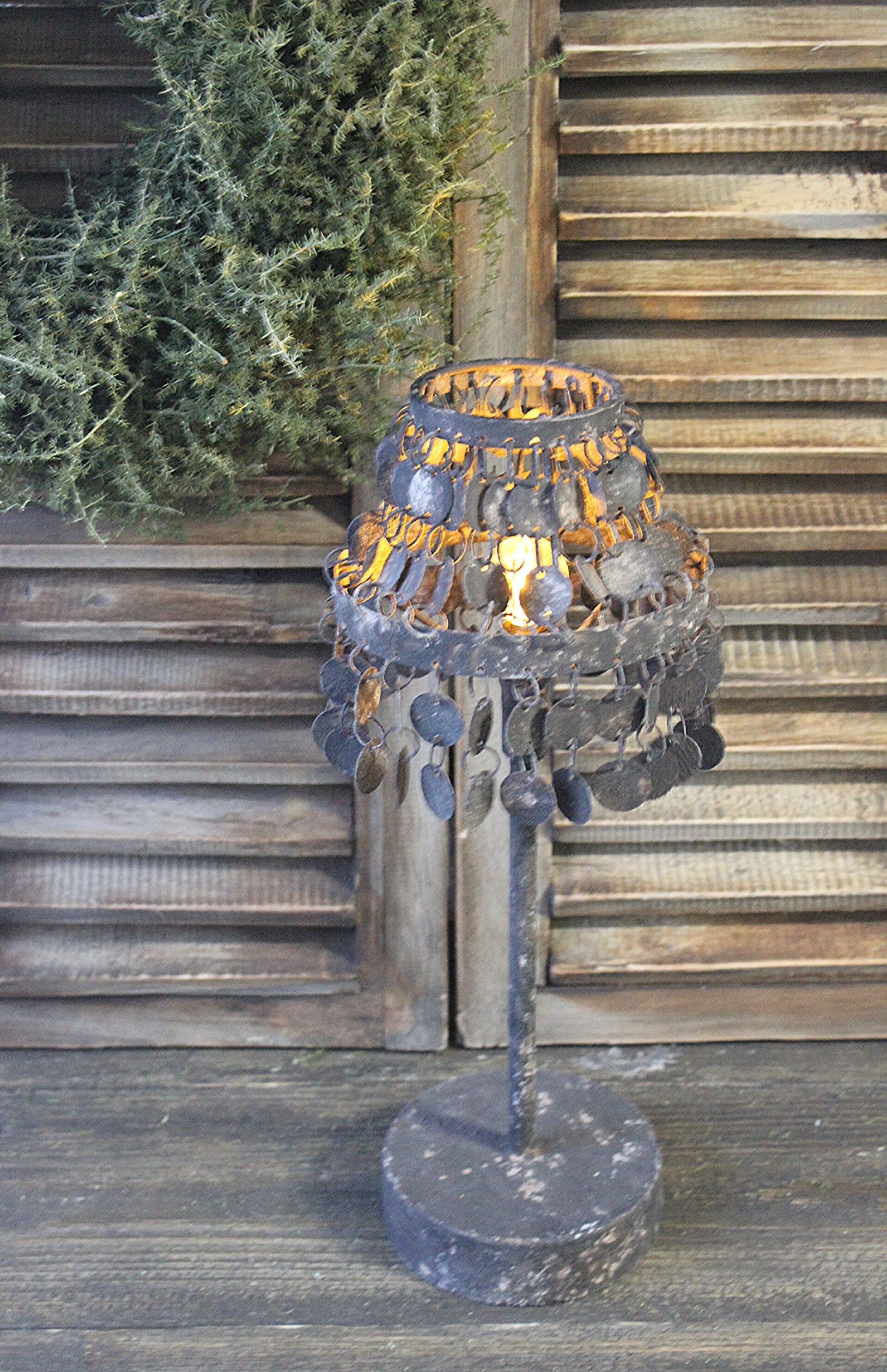 Stoer, rustiek tafellampje, afgewerkt met muntjes. Het aan/uit-knopje zit aan de voorzijde, waardoor het lampje eenvoudig te bedienen is. Het werkt op twee AA-batterijen (niet inbegrepen).